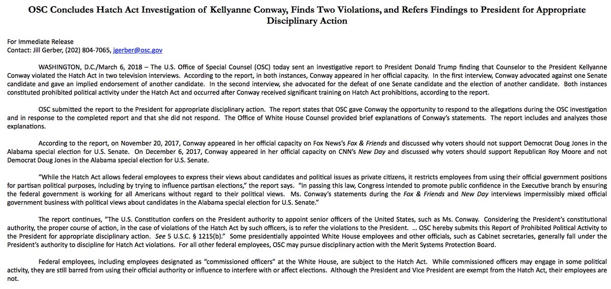 JUST IN: Office of Special Counsel finds Kellyanne Conway twice violated the Hatch Act and "submitted the report to the President for appropriate disciplinary action."pic.twitter.com/N6kyhhqdrW