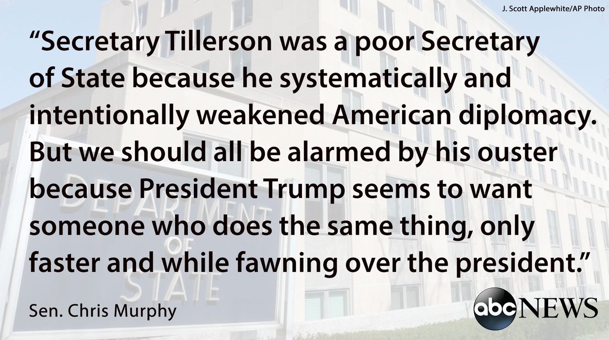 NEW: Sen. Chris Murphy: “Secretary Tillerson was a poor Secretary of State because he was systematically and intentionally weakening American diplomacy. But we should all be alarmed by his ouster.” http://abcn.ws/2GmY13D pic.twitter.com/EPt7zxvM4k