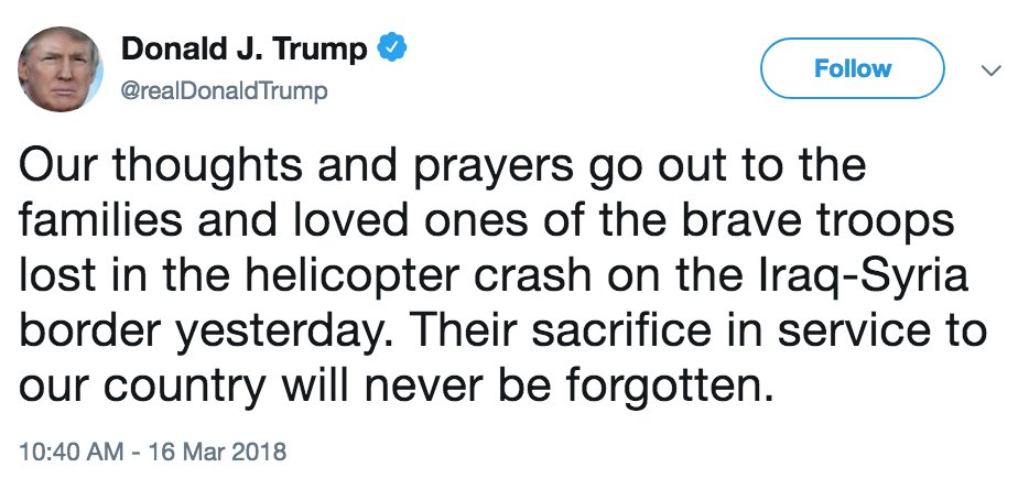 NEW: Pres. Trump on seven personnel who died in U.S. helicopter crash in western Iraq: "Their sacrifice in service to our country will never be forgotten." http://abcn.ws/2DxBv58 pic.twitter.com/RDqEViGDvJ