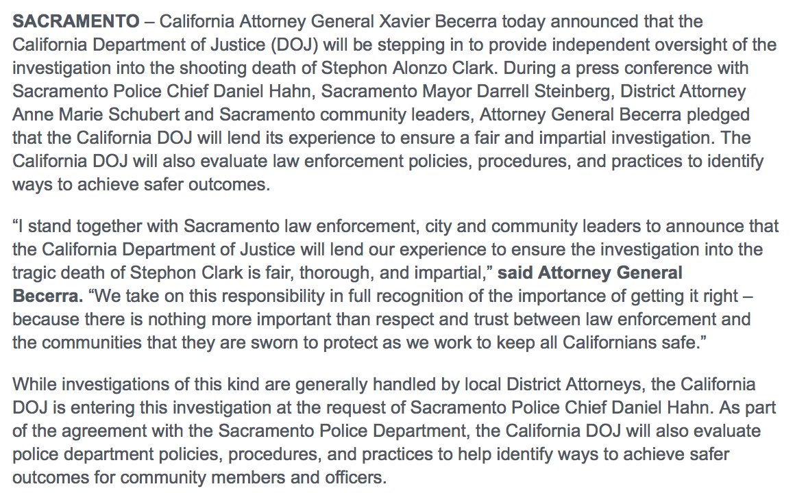 NEW: California Dept. of Justice to provide independent oversight into investigation of fatal police shooting of Stephon Clark, Attorney General Becerra announces. https://abcn.ws/2pJfyvP pic.twitter.com/34Bi0qmRol