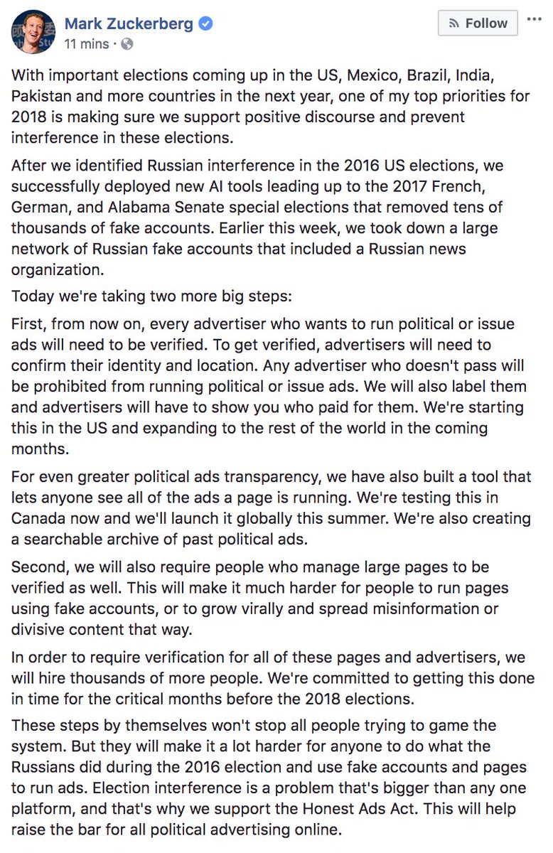 NEW: Facebook CEO Mark Zuckerberg: New steps "will make it a lot harder for anyone to do what the Russians did during the 2016 election and use fake accounts and pages to run ads." http://abcn.ws/2IyMOg6 pic.twitter.com/N3feWeLVeh