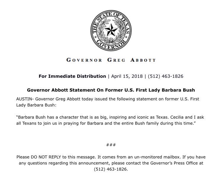 #BarbaraBush? Absolutely. I've always liked her. But#GregAbbott? The sooner the good people of Texas vote him out the better! - 1 more reply