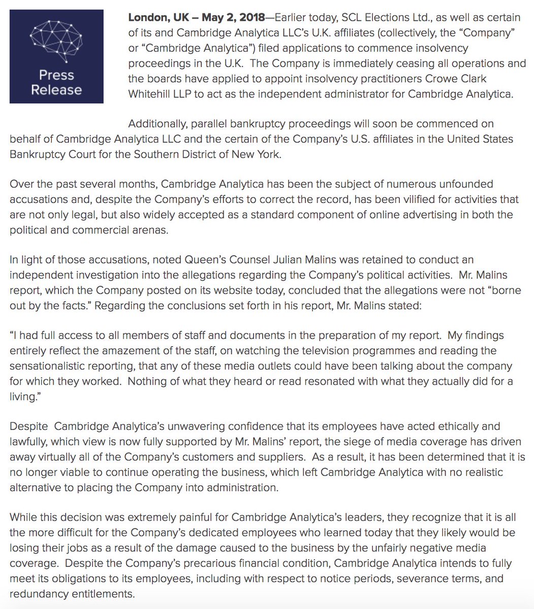 NEW: Cambridge Analytica, analytics firm at center of Facebook data scandal, ceases all operations, commences insolvency and bankruptcy proceedings in U.K. and U.S. https://abcn.ws/2FBwIRc pic.twitter.com/1huhJ8x1JW