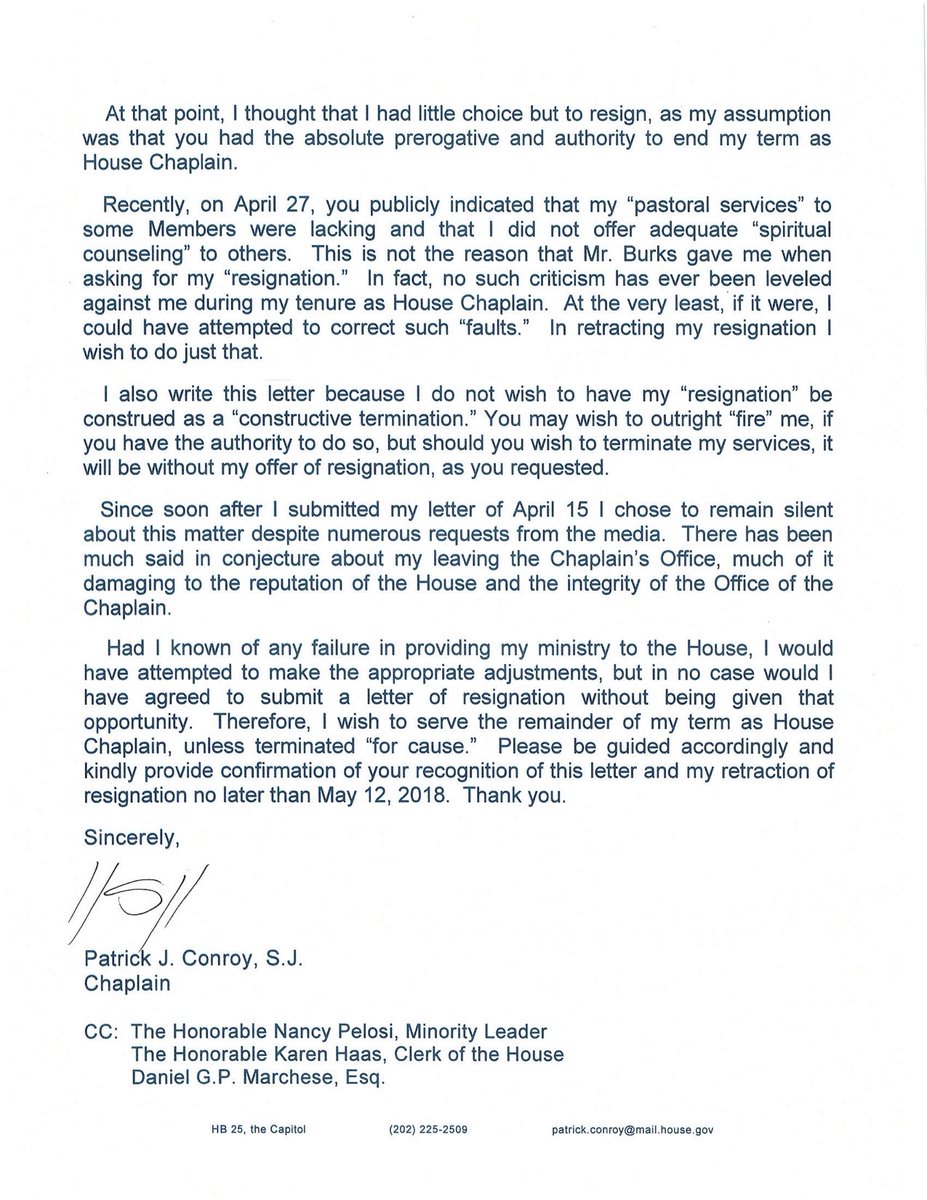 NEW: House Chaplain Father Conroy rescinds resignation in letter to Speaker Ryan. "I have never been disciplined, nor reprimanded, nor have I ever heard a complaint about my ministry during my time as House Chaplain," he writes. https://abcn.ws/2KxWPfv pic.twitter.com/77avBNoXPo
