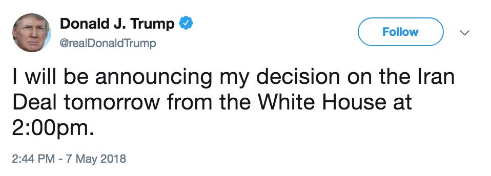 So if the president does decide to pull the US out of the Joint Comprehensive Plan of Action (JCPOA), which was brokered by seven parties and signed in 2015, it would place everyone in uncharted territory @realDonaldTrumppic.twitter.com/H1lX3XXnLl