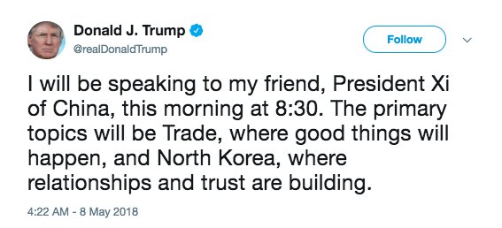 I wonder if Trump will talk about how hard the agriculture industry is being hit right now, as China is buying farm crops elsewhere.https://www.cnbc.com/2018/05/04/angst-in-farm-belt-after-reports-that-china-halted-buying-us-soybeans.html …