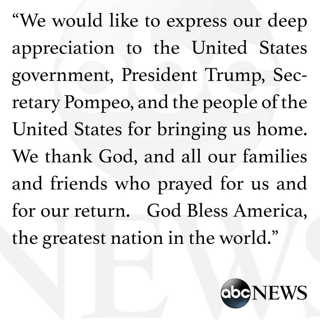 NEW: State Dept. releases statement from the three Americans freed from North Korea. "We would like to express our deep appreciation to the U.S. government, President Trump, Secretary Pompeo, and the people of the United States for bringing us home." https://abcn.ws/2KOPIj1 pic.twitter.com/DzGddjiV3g