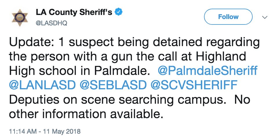 UPDATE: One gunshot victim in stable condition, one firearm recovered, Los Angeles County Sheriff's Department says. http://abcn.ws/2KTv1lO pic.twitter.com/se7W5r6J4A