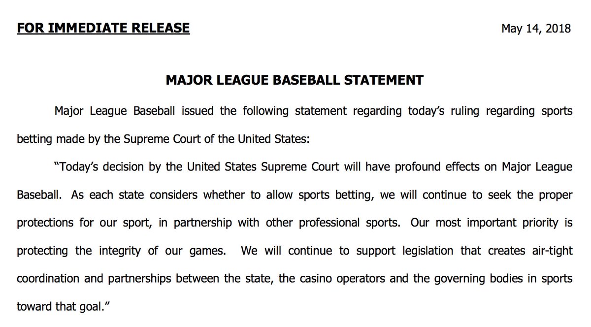 NEW: MLB responds to Supreme Court decision on sports betting: “Today’s decision by the United States Supreme Court will have profound effects on Major League Baseball...Our most important priority is protecting the integrity of our games." http://abcn.ws/2L1ltFy pic.twitter.com/x1Mc1QsWi5