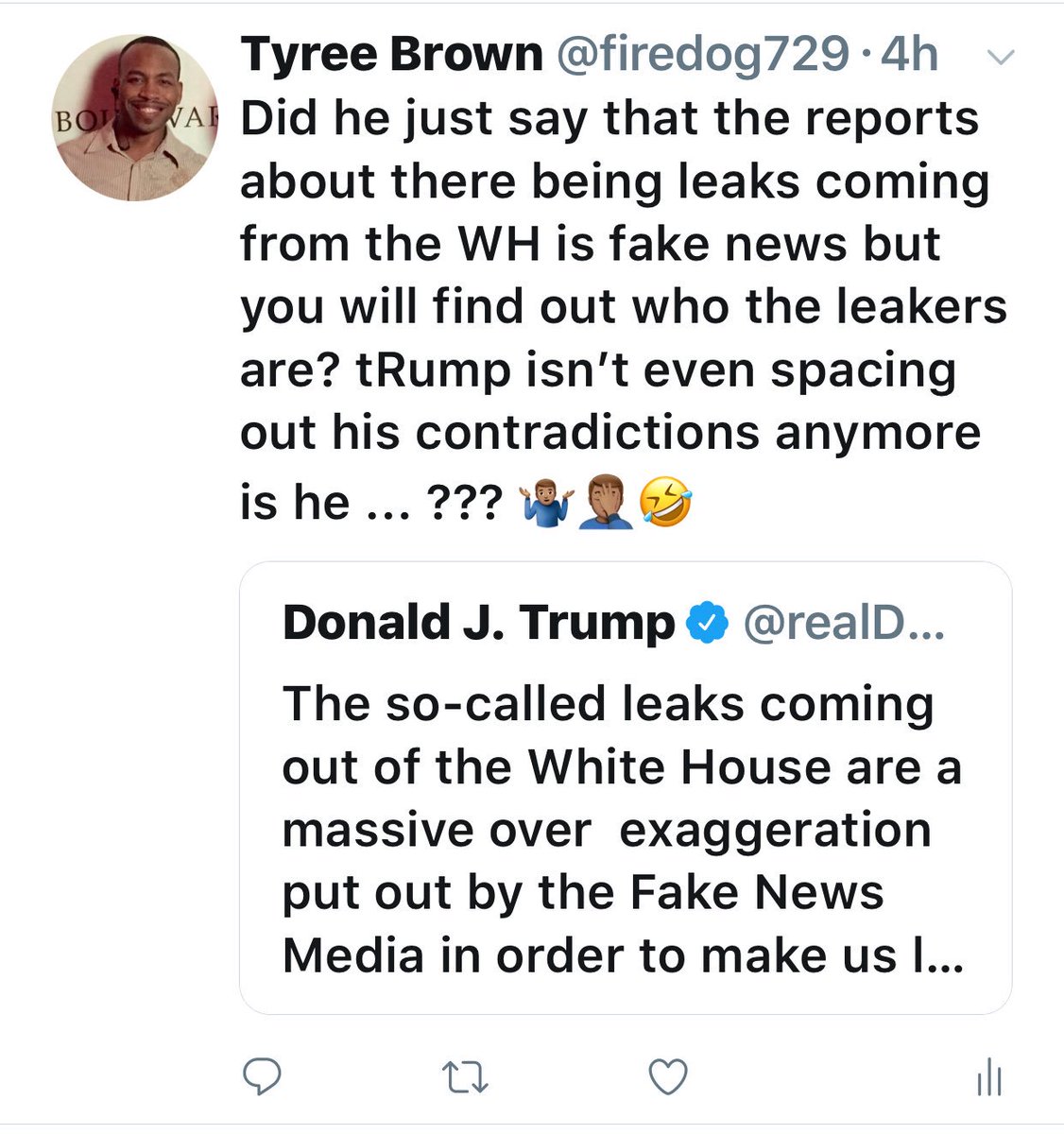 In summary, the fake news media is lying about the leaks but he's going to find out who the leakers are. Brainy stuff.