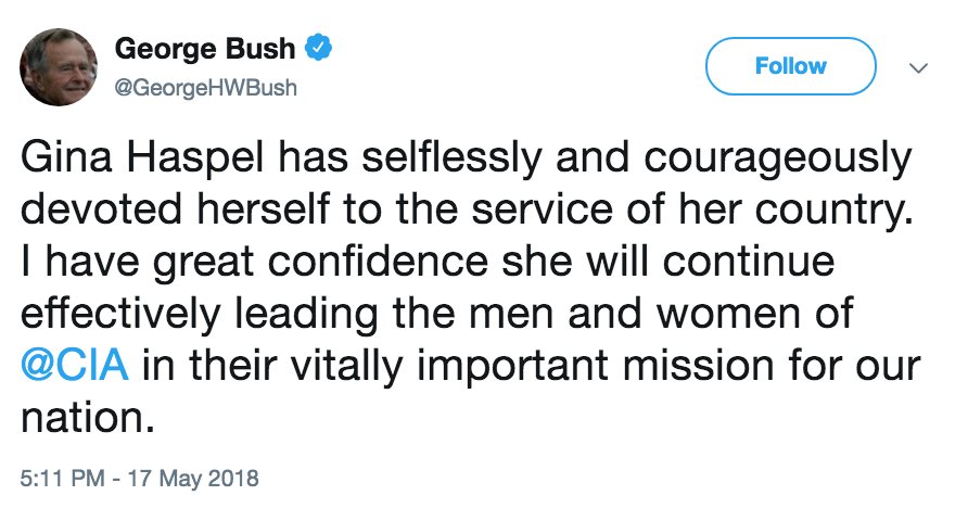 NEW: George H. W. Bush praises confirmation of Gina Haspel as CIA director. "I have great confidence she will continue effectively leading the men and women of @CIA in their vitally important mission for our nation." http://abcn.ws/2wRz1Aj pic.twitter.com/XNi0fAD3q9