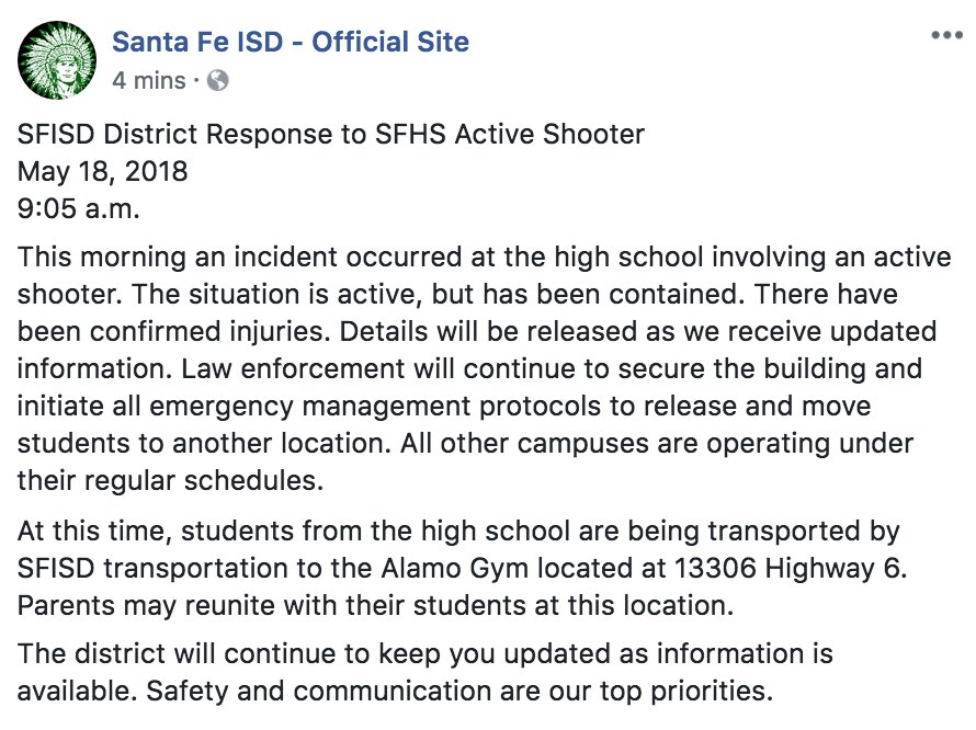DEVELOPING: School district on lockdown in Sante Fe, Texas due to incident at high school involving active shooter.pic.twitter.com/qZ7Gz86FiE