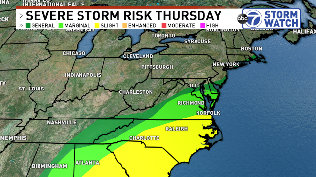 In addition to the INCHES of rain expected this week, we also have the risk of strong thunderstorms on Thursday. Parts of the DMV under a Marginal risk, meaning isolated strong to severe storms poss.