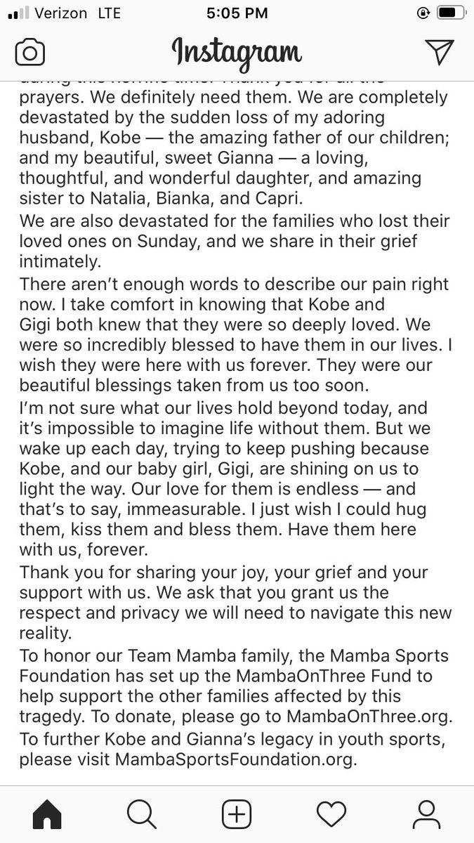 Vanessa Bryant has just made her first public comments on the passing of husband Kobe Bryant and daughter Gianna. “There aren’t enough words to describe our pain right now. I take comfort in knowing that Kobe and Gigi knew they were so deeply loved”