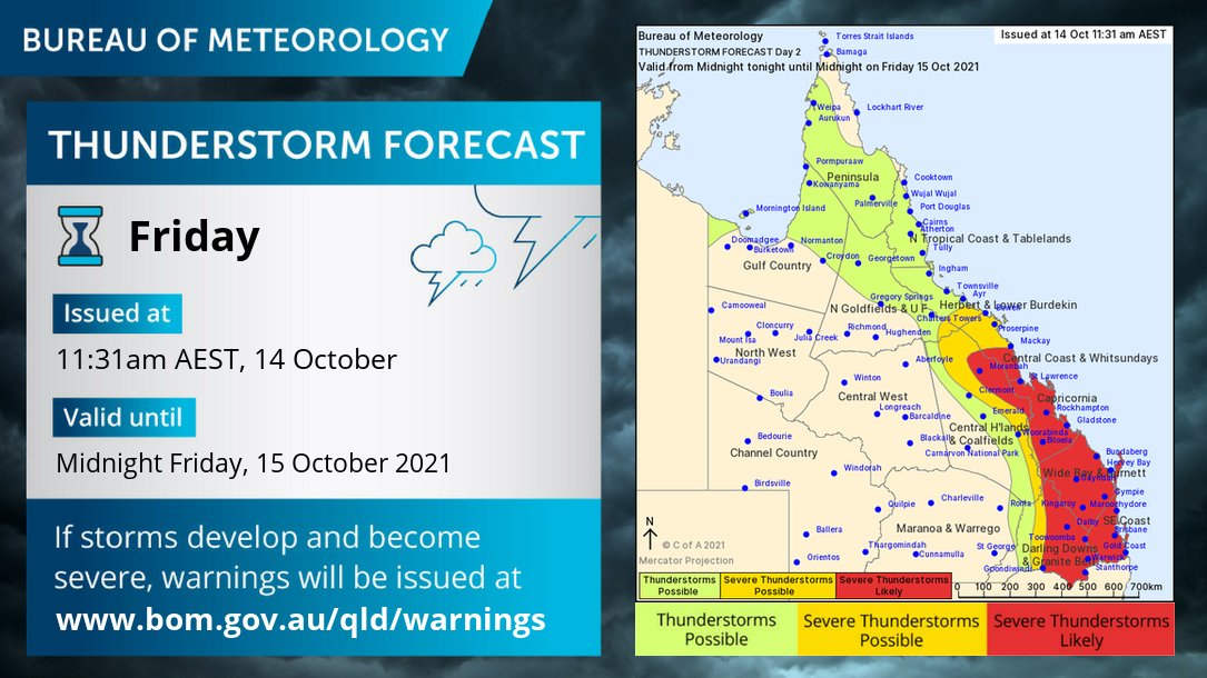 QLD TS Forecast Fri 15th Oct: Another stormy day in eastern QLD on Friday with severe thunderstorms likely from Mackay to the NSW border. High end thunderstorms with destructive winds, giant hail & intense rainfall possible. Clearing from the south during the early afternoon.pic.twitter.com/HWnMiSsI56