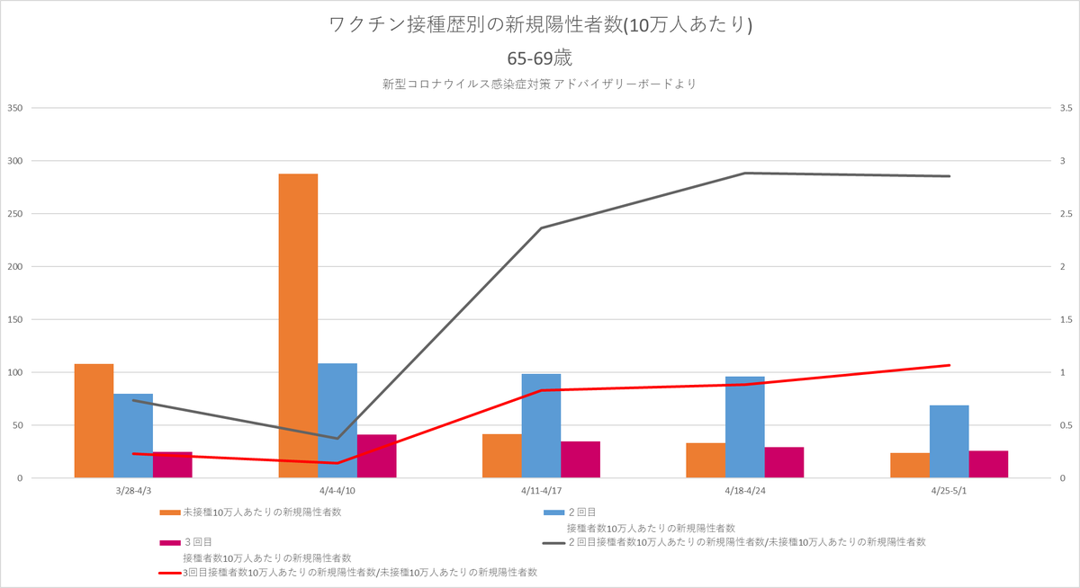 森田先生のお手伝いのつもりで、アドバイザリーボードのデータ整理してたらさ。 最新のデータで65-69歳だと3回接種した人人の方が未接種よりも10万人あたりの感染者多いのね。すでに。 あと「接種歴不明」を未接種から外したら「逆効果」が鮮明になったのちょっとひどくないですかね。 https://twitter.com/MNHR_Labo/status/1525224654285459456 …pic.twitter.com/S7rrkvagxp