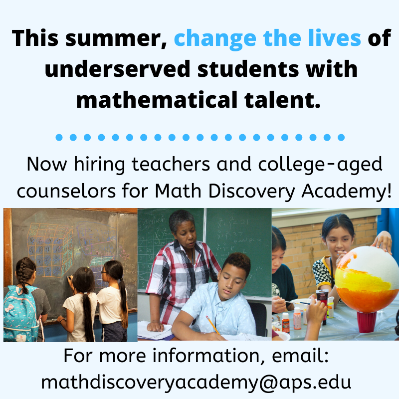 This summer, change the lives of underserved students with mathematical talent. Now hiring teachers and college-aged counselors for Math Discovery Academy! learn more by emailing mathdiscoveryacademy(at)aps(dot)edu.pic.twitter.com/DvWvHkdDKJ