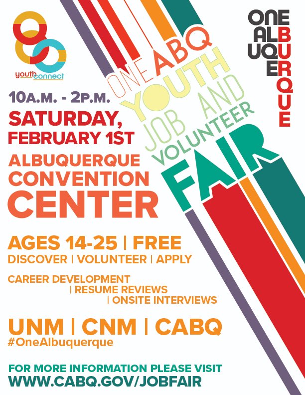 Share the word with youth and young adults to come out to the 2nd Annual CABQ job fair this Saturday! For more information: http://www.cabq.gov/jobfair pic.twitter.com/Kki9crttxd