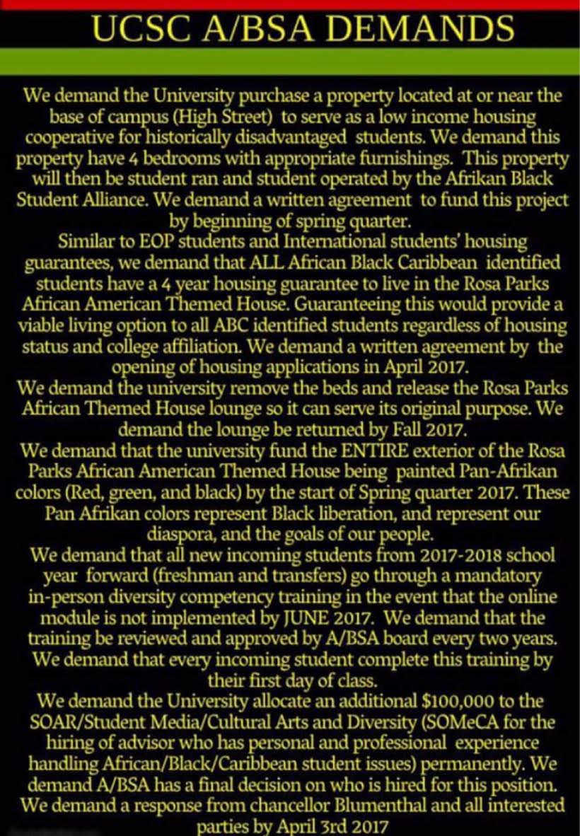 Afrikan Black Student Alliance at UC Santa Cruz Launches Demands for Institutional Change. http://afrikanblackcoalition.org/2017/03/06/afrikan-black-student-alliance-at-uc-santa-cruz-launches-demands-for-institutional-change/ …pic.twitter.com/7zqHI2fFOp