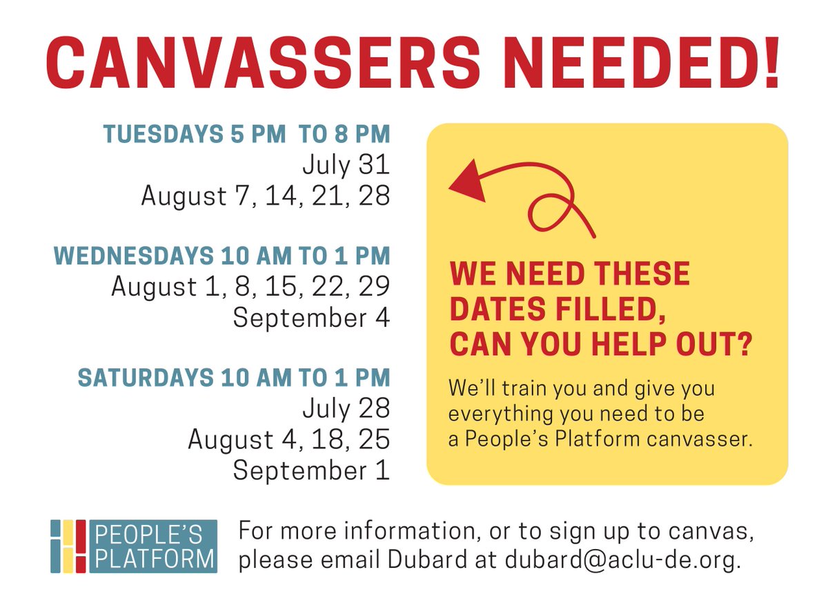 We need volunteer canvassers to help promote the People's Platform. We, the people, can push the change we want to see. Email dmcgriff@aclu-de.org for more information.pic.twitter.com/4IK6uwOfhF
