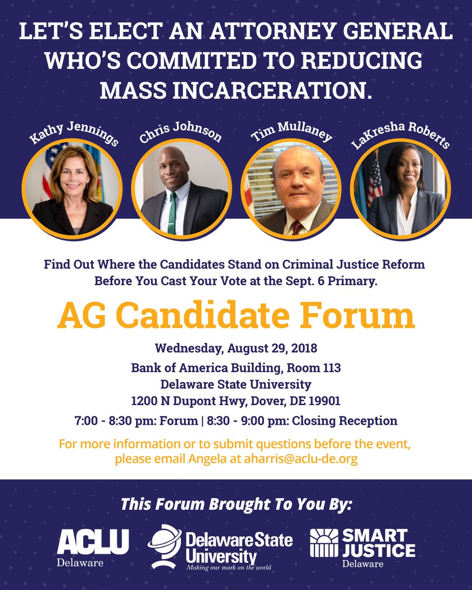 Who will make the most impactful commitment to change? Don't miss this opportunity to learn more about each Attorney General candidate before the September 6th primary election. Make an informed decision, then #VoteSmartJusticeDE at the polls. RSVP: http://bit.ly/AGForumDE pic.twitter.com/7fsYU1SfuT