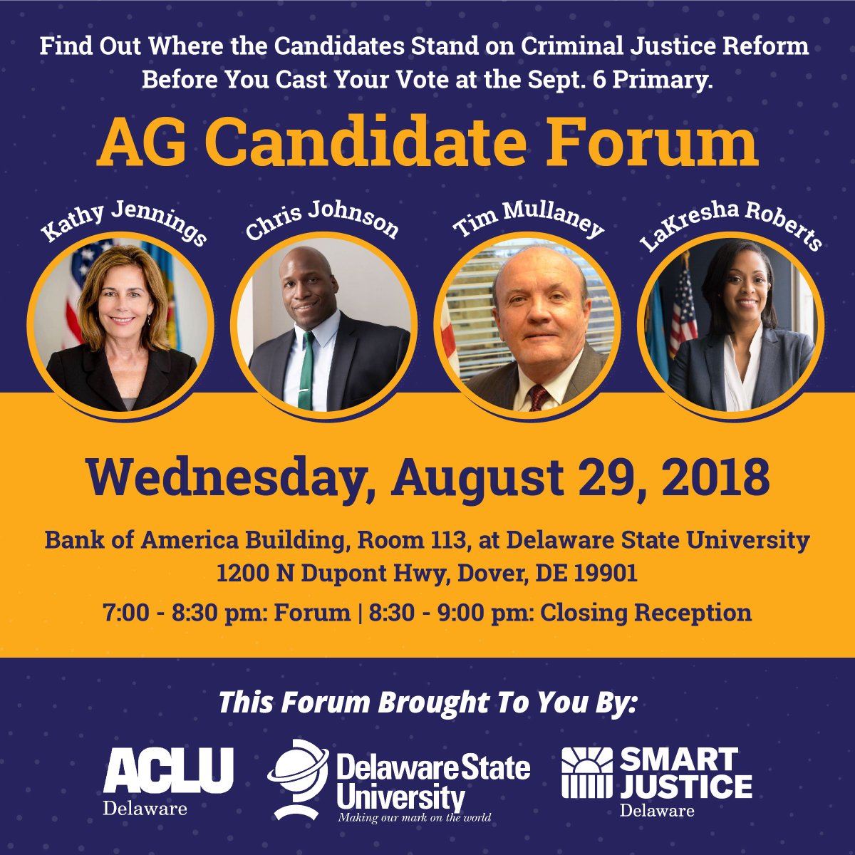 What do you want to know about how the next Attorney General can change the criminal justice system? Submit your questions for the candidates to aharris@aclu-de.org and join us at the forum to hear the answers. RSVP: http://bit.ly/AGForumDE pic.twitter.com/YbamjYNoFm