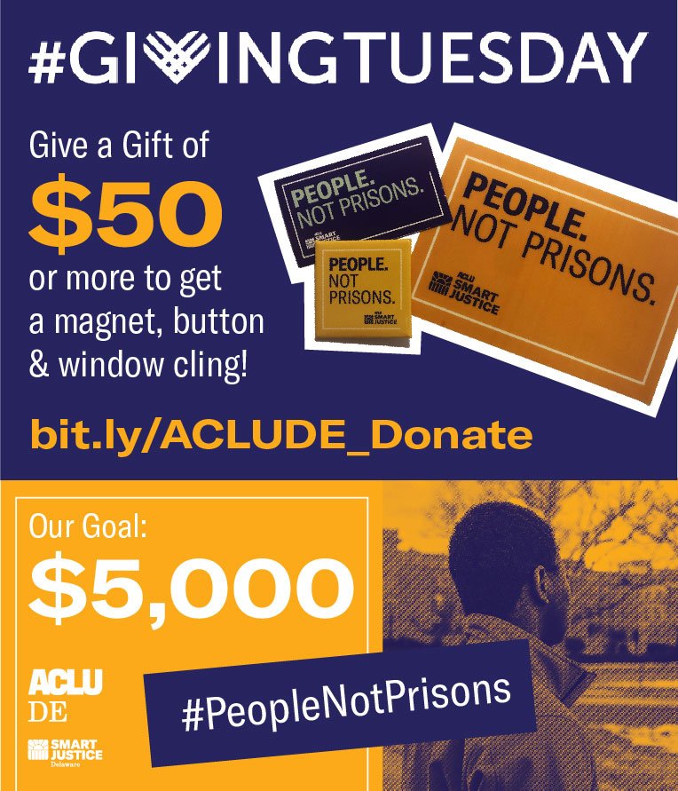 We're almost to $1,000! Will you consider helping us reach our goal of $5,000 this #GivingTuesday? Your gift will help us end mass incarceration in Delaware! Reminder: a $50 gift will get you a magnet, button and window cling! Donate Now: http://bit.ly/ACLUDE_Donate pic.twitter.com/i5ZoWnleIo