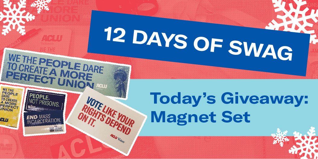 ✨ Happy 12 Days of Swag! ✨ Day 5️⃣: Why do you support the ACLU? We're closing out the year by giving away one prize every day for 12 days on social media! 🎁 Enter to win today's giveaway by answering today's question in the comments below (rules in thread) 👇pic.twitter.com/uQekJZJLnq