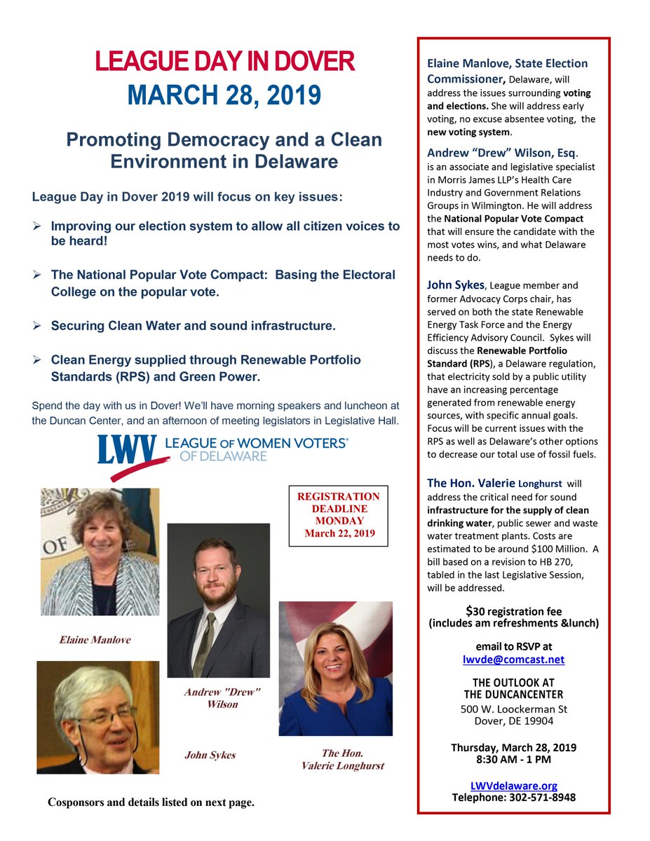 Tomorrow is the last day to register for the @LWVDE League Day event happening next Thursday! The theme for this year's League Day is "Promoting Democracy and a Clean Environment in Delaware." More info in the flier below 👇pic.twitter.com/qNycXPvsRc