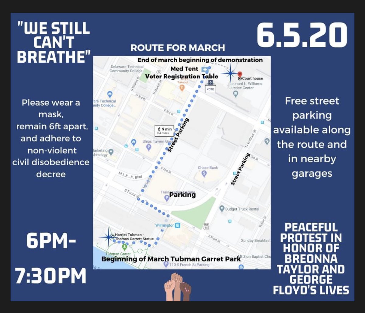 Reminder: Peaceful protest in honor of Breonna Taylor & George Floyd happening 6pm tonight in Wilmington. Protest organizers are asking people to bring these items to contribute to the movement: water, masks, ponchos, first aid kits, & signs. More info: https://facebook.com/events/s/we-still-cant-breathe-march-fo/245145086777253/?ti=icl …pic.twitter.com/WxONpK4dP2