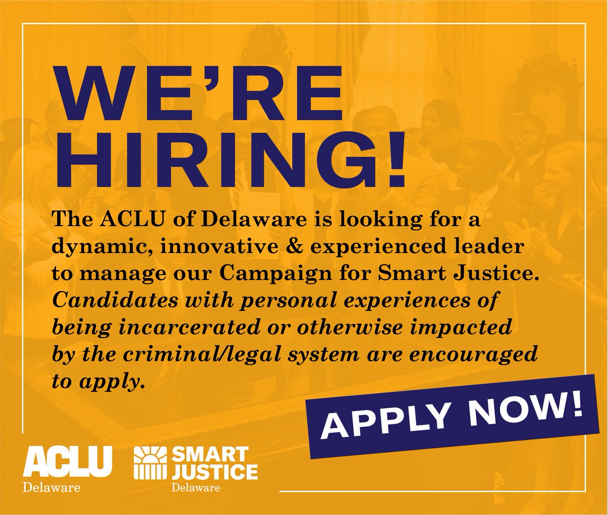 We're hiring! ACLU-DE is looking for a dynamic & experienced organizer to lead Smart Justice efforts in DE. Candidates w/ personal experiences being incarcerated or impacted by the criminal/legal system encouraged to apply. More info & how to apply: https://www.aclu-de.org/en/news/now-hiring-smart-justice-campaign-manager-apply-today …pic.twitter.com/g0I5pp8874