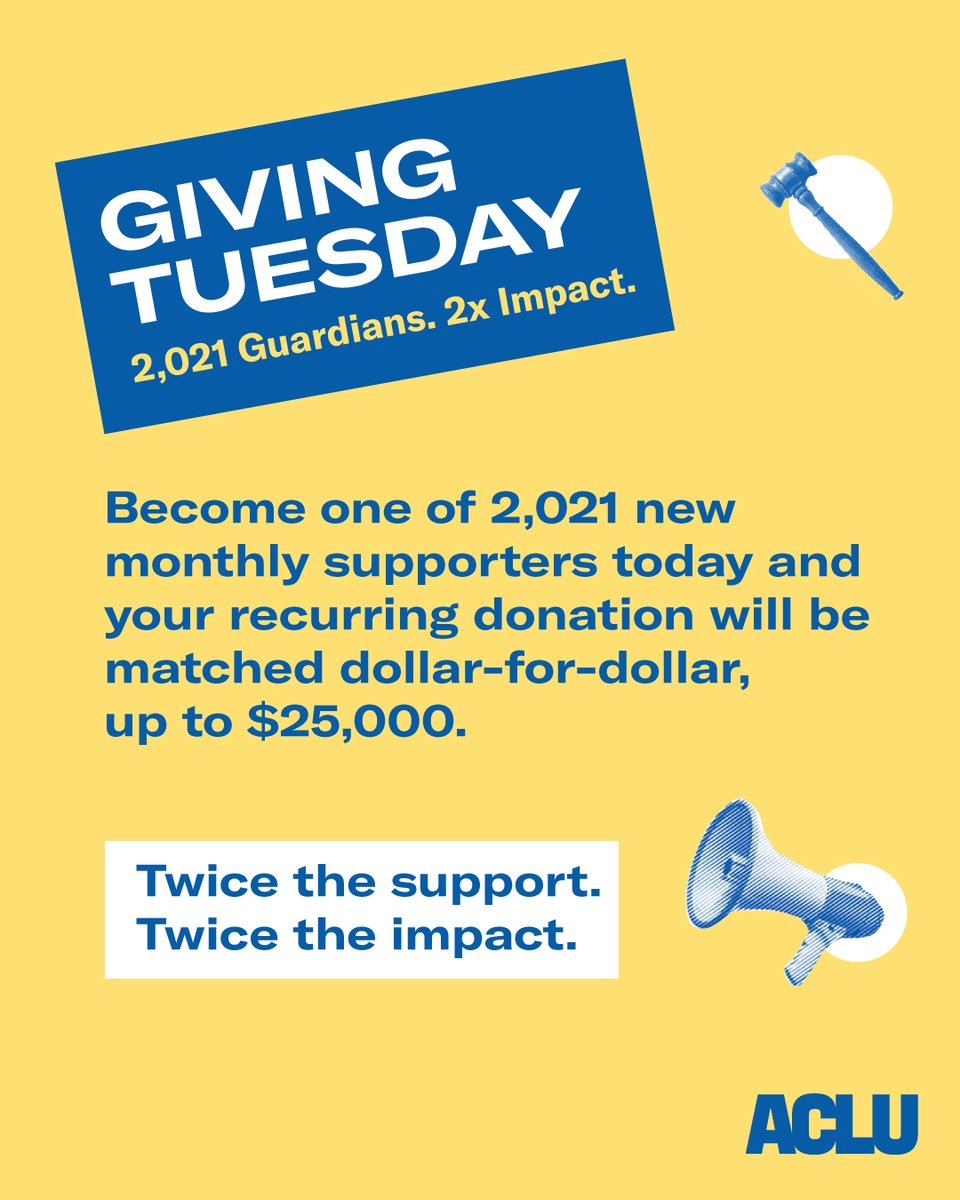 In the face of everything 2020 had to throw at us, ACLU Guardians of Liberty enabled us to keep going no matter what. As we look at the fights ahead, we know we'll need your help to keep winning. Become a monthly supporter this Giving Tuesday. http://ow.ly/pOqK50CyFVt pic.twitter.com/q6uTbmzRUI