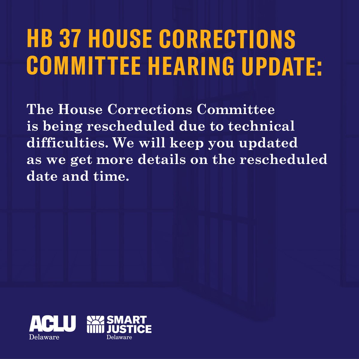 The House Corrections Committee is being rescheduled due to technical difficulties. We will keep you updated as we get more details on the rescheduled date and time. Stay tuned for updates here: https://www.aclu-de.org/en/news/hb37 pic.twitter.com/lDP6dSYkej