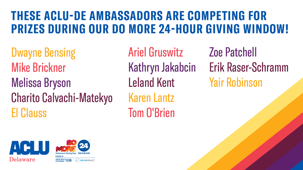 Do More 24, but make it competitive. These incredible ACLU-DE ambassadors are competing to raise money for us during #DoMore24DE. Donate directly to an ambassador’s campaign by choosing which person(s) to support during our 24-hour giving window here: https://www.domore24delaware.org/fundraisers/do-more-for-civil-liberties-in-delaware …pic.twitter.com/wTDB9H4JkM