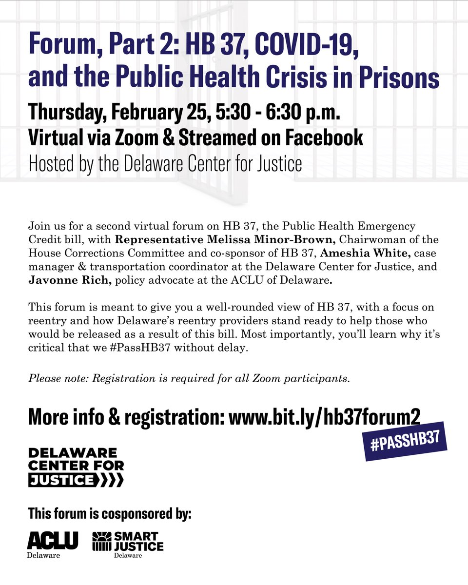 Delaware Center for Justice is hosting a second virtual forum on HB 37, the public health emergency credit bill, at 5:30pm on 2/25. Join us to talk about HB 37 from a reentry perspective & find out what comes next in this bill's journey. Register now: https://zoom.us/meeting/register/tJ0rduqoqj4tH9TGWfmzCRCRmDPLHZC9Z9Al …pic.twitter.com/OGRIcUJIML