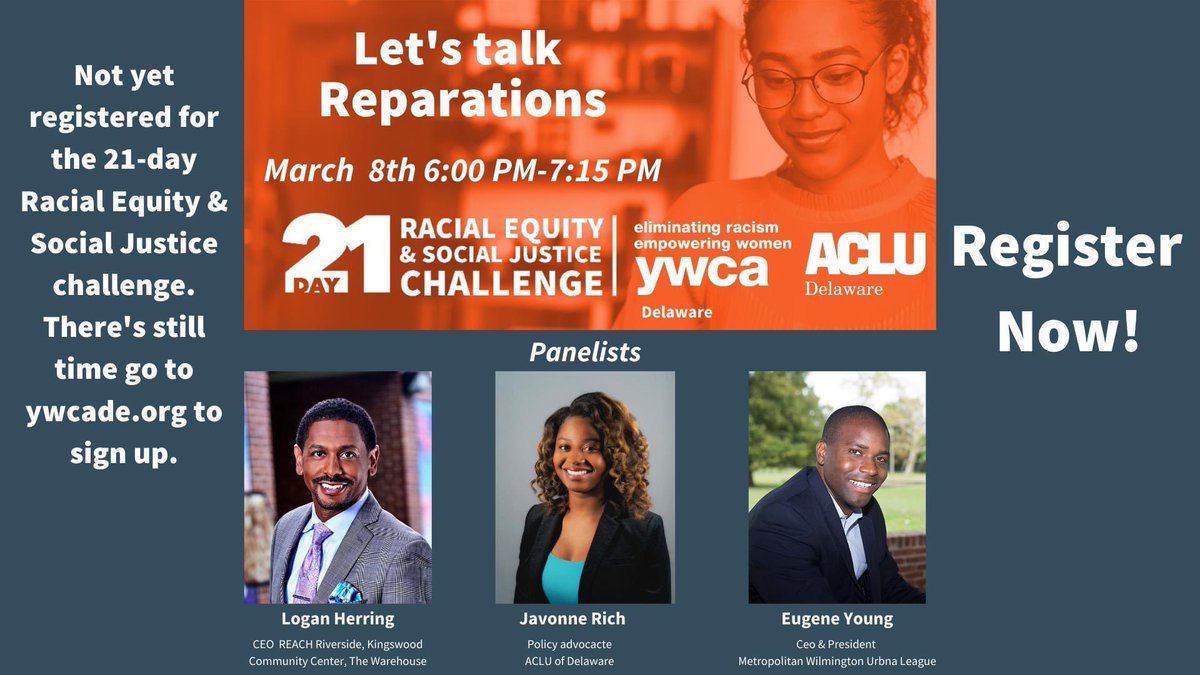Happening tonight: We’re partnering with @ywcade tonight to talk about reparations, featuring Logan Herring, Javonne Rich, and Eugene Young. Join us there! The virtual event starts at 6pm. More info & registration: https://fb.me/e/5dytaNgwU pic.twitter.com/Xhl7NhJJfq