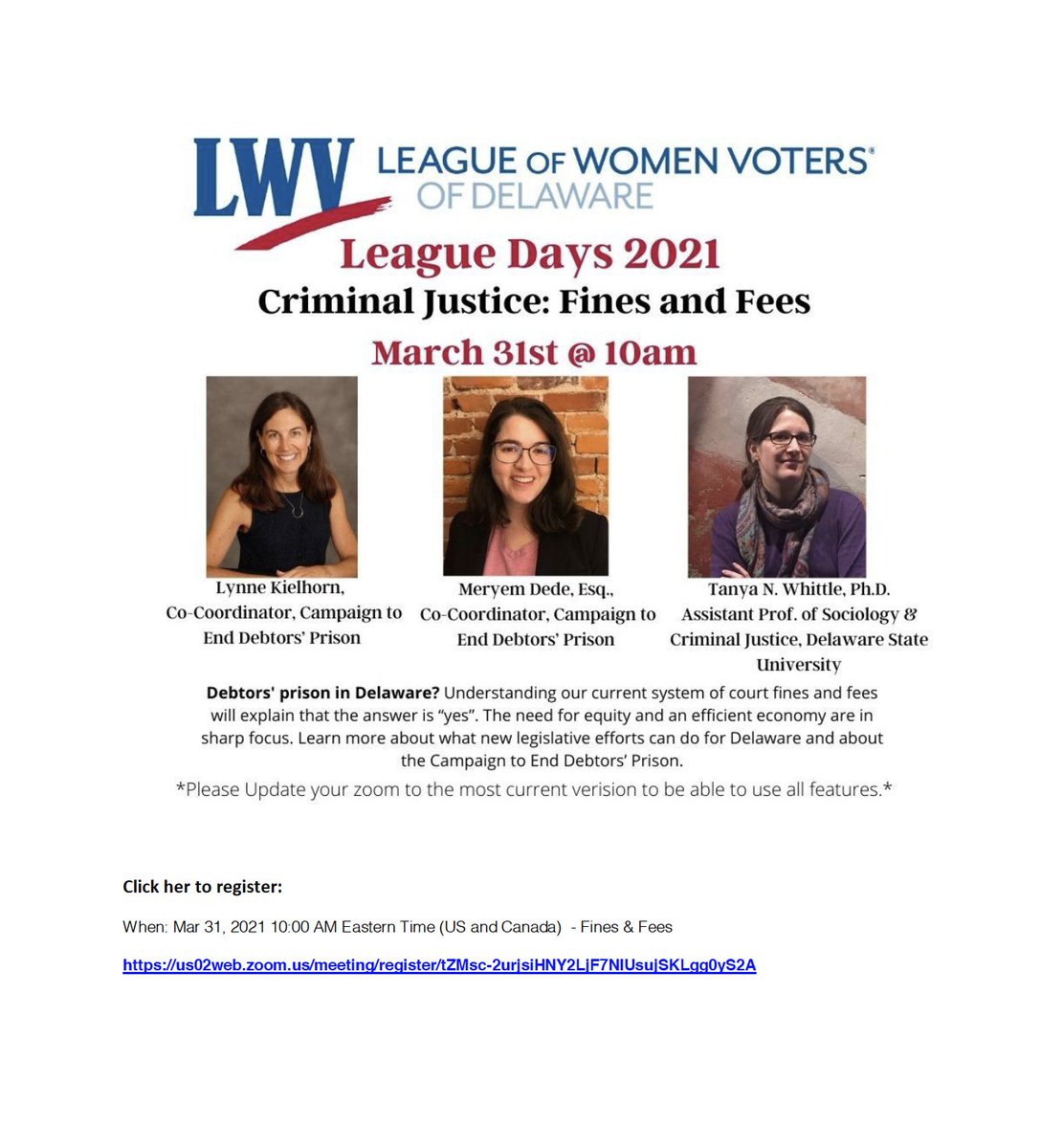 Join @LWVDE for the last event of their League Days series on 3/31 at 10am, virtual via Zoom.