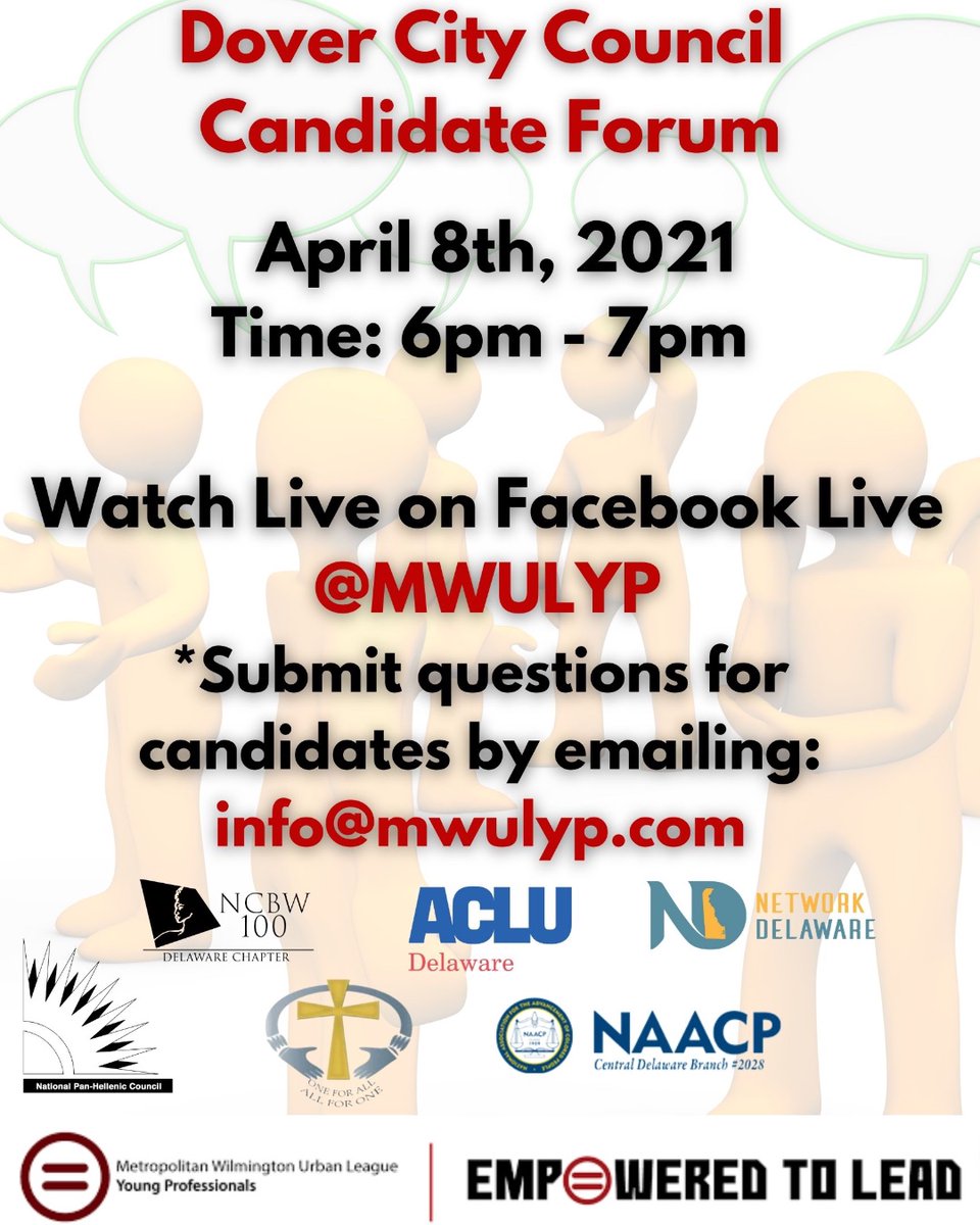 Reminder: Join the Metropolitan Wilmington Urban League Young Professionals tomorrow at 6pm for a Dover City Council candidate forum, virtual via Facebook live. Make your voice heard! Submit your questions to info@mwulyp.org.pic.twitter.com/zIYaomgYDE