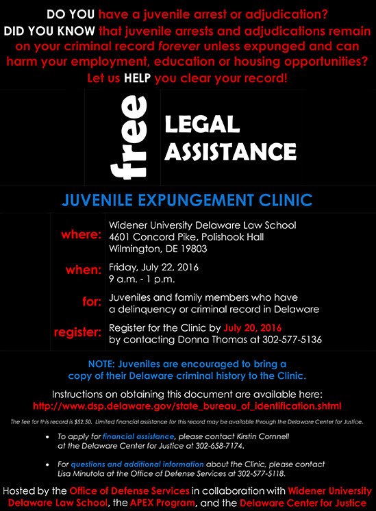 FREE Juvenile Expungement Clinic, Wilmington, 7/22. Registration requested today. More info: http://buff.ly/29W9l5J pic.twitter.com/bx7M1A1iV9
