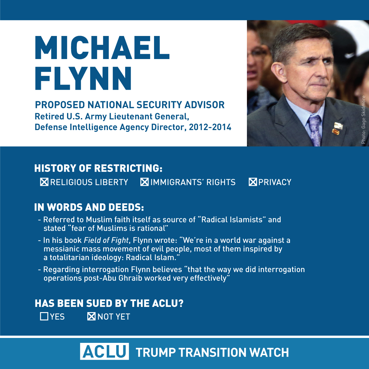 Proposed National Security Advisor Michael Flynn has a history of wanting to restrict religious liberty and privacy. #trumptransitionpic.twitter.com/o9ESC6nifP