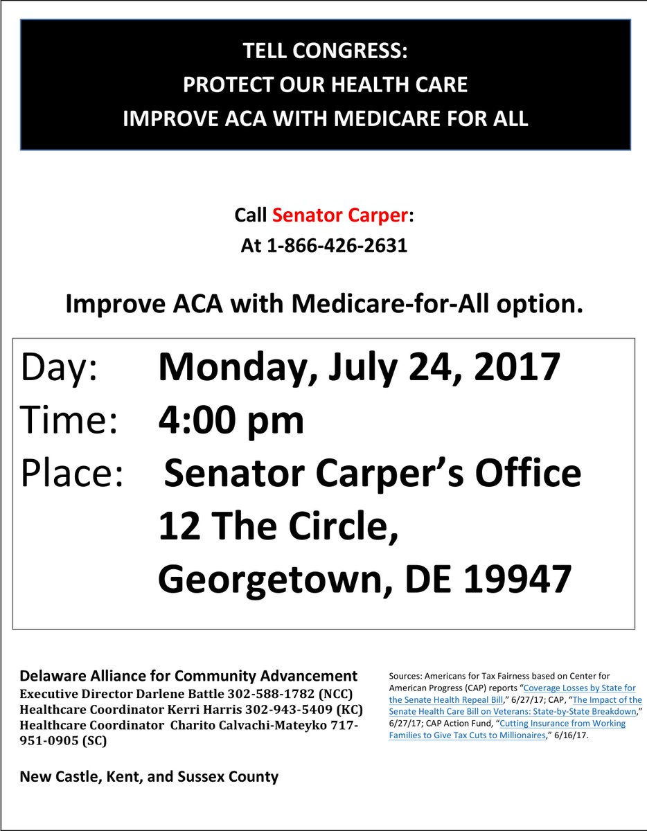 Rally supporting #ACA at Sen. Carper's Georgetown office, July 24. Please come and share how you or loved one affected if repealed.pic.twitter.com/NCcD1cv3gf