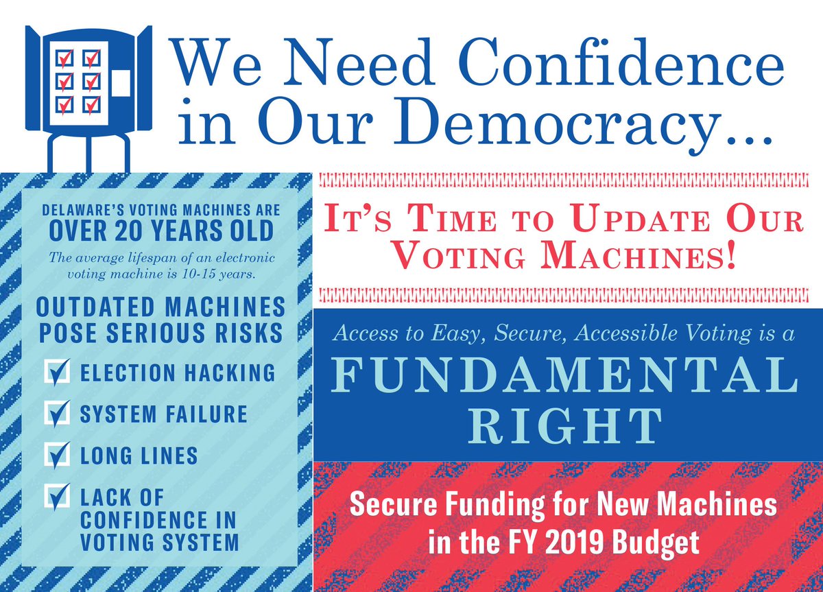 Voting safeguards our democracy. We deserve efficient, accessible, & secure voting machines. Our current equipment is too outdated to push this off any longer - bring DE into the modern age, @JohnCarneyDE! Include new voting machines in FY19's budget. #DENeedsNewVotingMachinespic.twitter.com/ksleBCaP7S