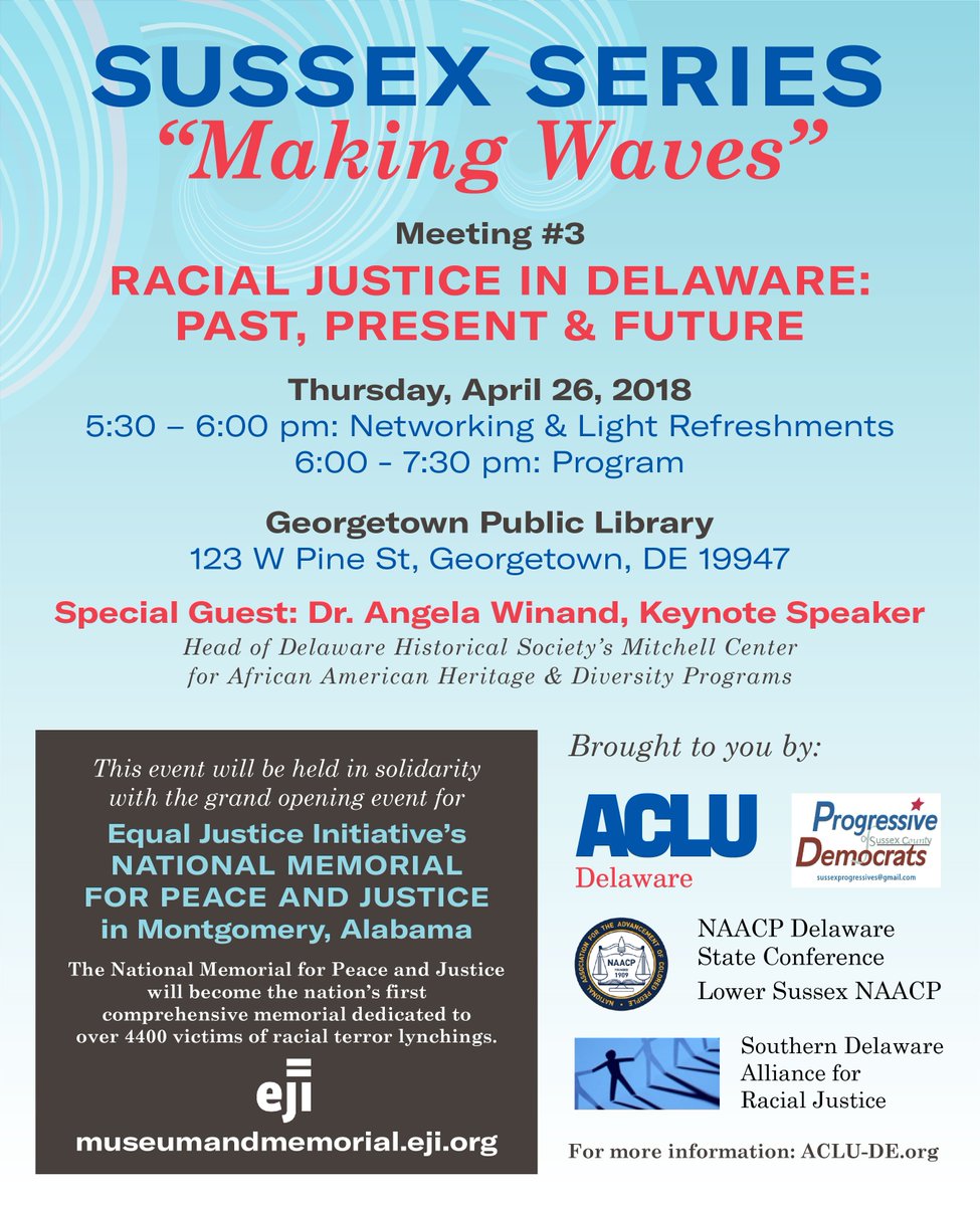 Our next Sussex Series event will take a look at how a history of racial injustice lead to mass incarceration in Delaware, and then we'll talk about what we're doing to change the future for black Delawareans. RSVP: http://ow.ly/5BNQ50h4RWV pic.twitter.com/PfBO6N8Qii