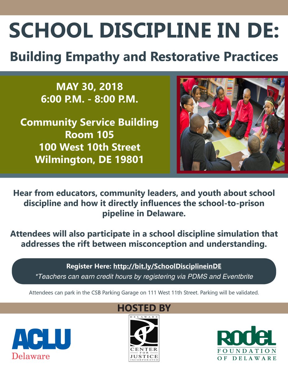 Come learn how current school discipline practices directly influence the school-to-prison pipeline in Delaware, and what you can do to fix it. Continuing ed. credits available! Register today