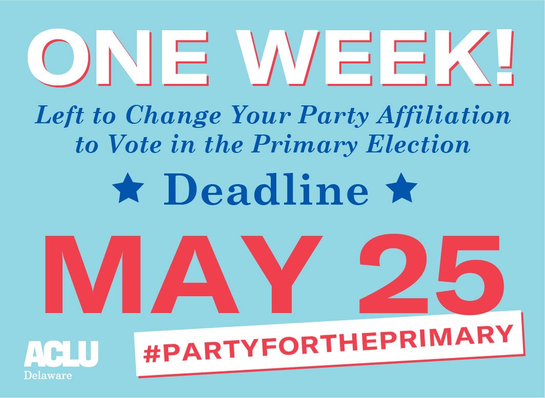 Just one week left to change your party affiliation to vote in the Primary Election! Change your affiliation here today: http://ivote.de.gov