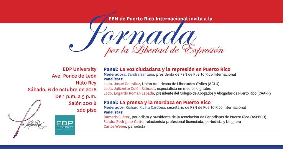 Puerto Rico Pen Club - Panel on Citizens Right to Protest and Repression in Puerto Rico. Panel: Josue Gonzalez-Oritz, ACLU; Julizzette Colon Bilbraut, digital media attorney; Edgardo Roman-Espada, President, PR Bar Association.pic.twitter.com/5PaCw9w6AP