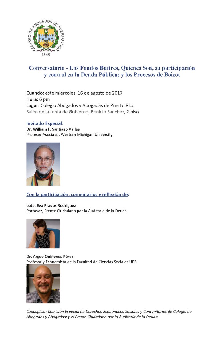 Invitación general: Conversatorio Fondos Buitres / Libre de costo / este miércoles 16 de agosto de 2017 / 6pm / Colegio Abogad@s de PRpic.twitter.com/xa5UovDoyE