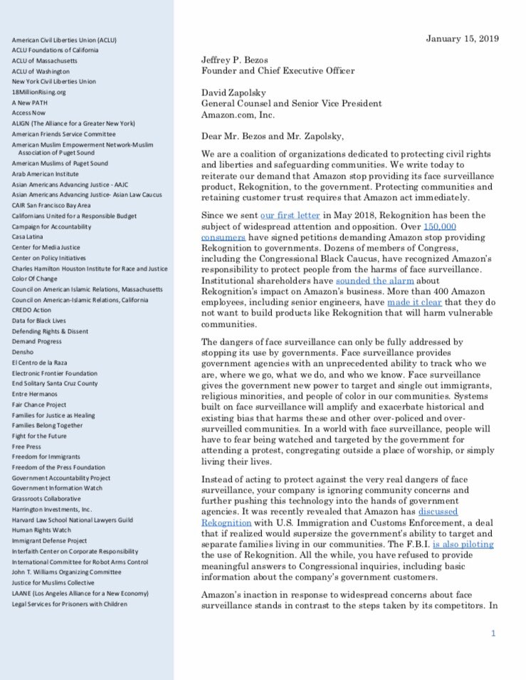 Today a nationwide coalition of 90 orgs applied new pressure on @Amazon, @Microsoft, and @Google to protect communities from dangerous face surveillance. https://www.aclu.org/news/pressure-mounts-amazon-microsoft-and-google-against-selling-facial-recognition-government …pic.twitter.com/x1pVqbTH8E