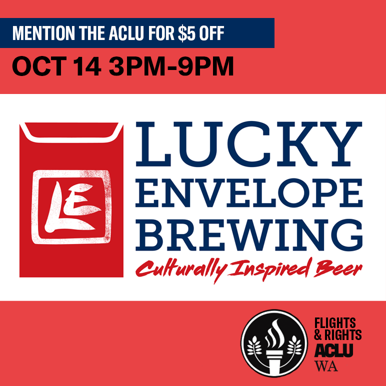 Beer flights for your fundamental rights! Mention the ACLU and get $5 off beer at @LuckyEnvBrewing in Seattle’s Ballard/Fremont neighborhood on 10/14, 3-9pm.