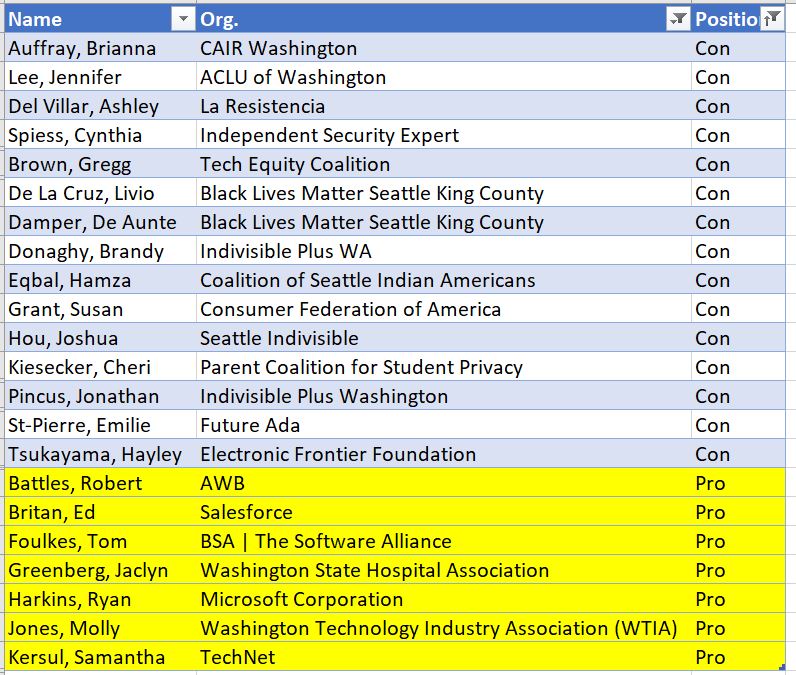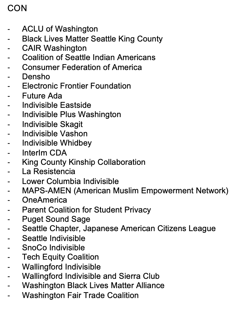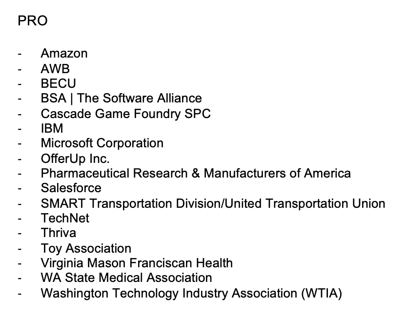 The Washington Privacy Act caters to all kinds of corporate interests from airlines to hospitals, etc. and creates loopholes for govt agencies & law enforcement. Just take a look a look at the list of the organizations who are PRO vs CON. 🗣️We need #RealPrivacy4WA. #walegpic.twitter.com/NDJweIALRs